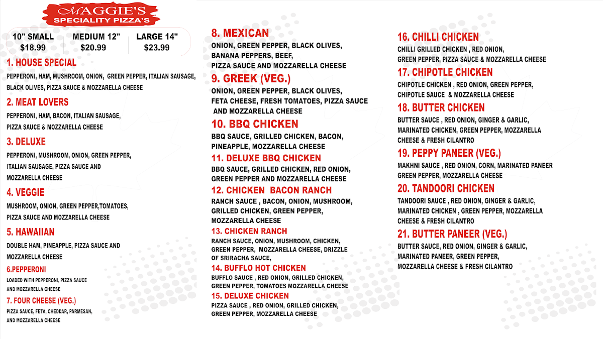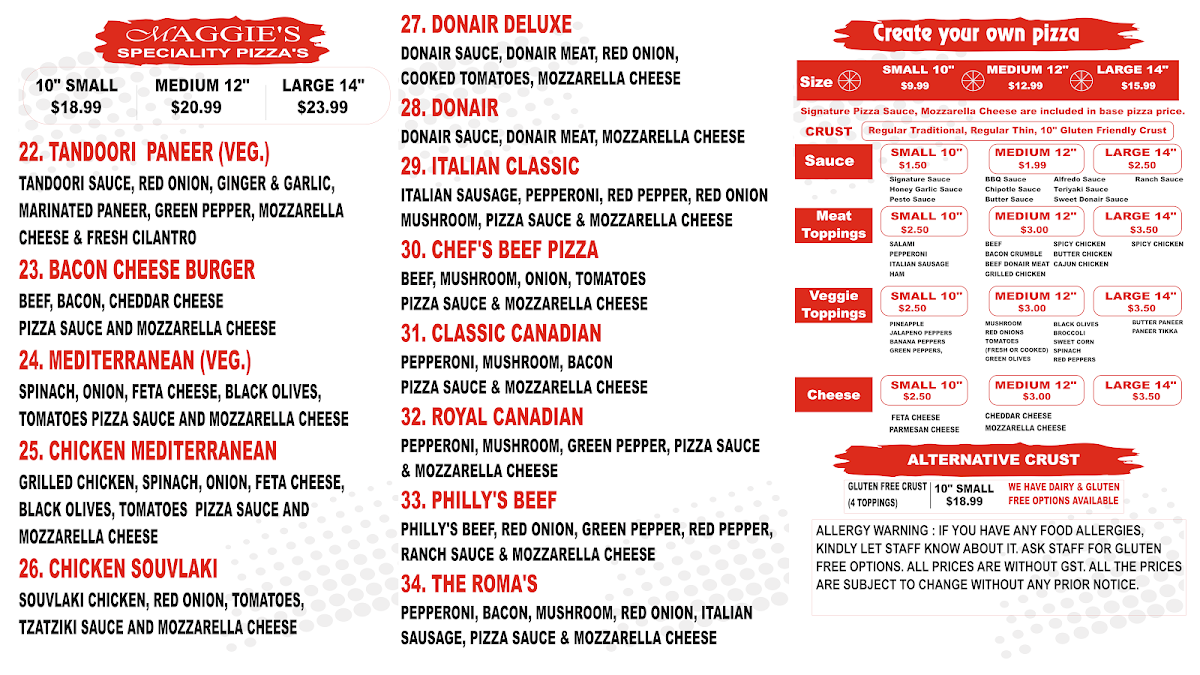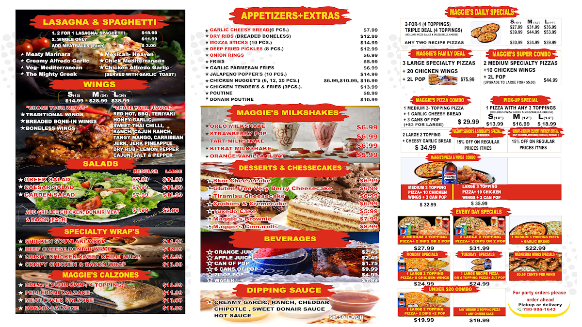 From a reviewer’s perspective, the menu at Maggie’s Pizzeria in Leduc feels like a well-rounded conclusion to what a neighborhood pizza place should offer-variety, value, and comfort. The value-focused MAGGIE’S FAMILY DEAL, MAGGIE’S SUPER COMBO, and MAGGIE’S PIZZA COMBO immediately stand out, making it easy for families or groups to order without overthinking. Daily savings are reinforced through Small 2-FOR-1, Medium 2-FOR-1, and Large 2-FOR-1, along with the generous SMALL TRIPLE DEAL and MEDIUM TRIPLE DEAL, which clearly cater to both solo diners and larger appetites. For dietary needs, the Gluten Free (Up to 5 Toppings) option shows thoughtful inclusion without compromising choice. Pizza lovers will appreciate the balance between classics and bold flavors in HOUSE SPECIAL, MEAT LOVERS, DELUXE PIZZA, ROYAL CANADIAN PIZZA, and HAWAIIAN, while plant-forward options like VEGGIE PIZZA, GREEK PIZZA, BUTTER PANEER PIZZA, MEDITERRANEAN PIZZA, and MARGARITA PIZZA add depth to the menu. The 1 PIZZA WITH ANY 3 TOPPINGS pick-up special is a smart, straightforward deal. Beyond pizza, shareable items such as 12 Traditional Wing/12 Boneless Wings, 24 Traditional Wing/24 Boneless Wings, and 36 Traditional Wings/36 Boneless Wings pair well with appetizers like MEDIUM GARLIC CHEESY BREAD, GARLIC CHEESY BREAD, DRY RIBS, MOZZA STICKS, and DEEP FRIED PICKLES. Freshness comes through with GREEK, CAESAR, and GARDEN salads, while hearty pastas like TWO For 1 LASAGNA/SPAGHETTI, Meatball Meaty Marinara, Meaty Marinara, Creamy Alfredo Garlic, and Veg-Mediterranean round out the comfort-food appeal. Wraps such as Chicken Souvlaki Wrap, Donair Wrap, Crispy Chicken Sweet Chili Wrap, and Crispy Chicken and Bacon Wrap add convenient alternatives. Desserts-including Maggie’s Brownie, Maggie’s CinnaRolls, Tuxedo Cake, Cookies’n Cream Cake, and SKOR Cheesecake gluten free-finish strong, especially alongside Oreo Milkshake, Strawberry Pop Tart Milkshake, or Orange Vanilla Float, with simple beverage options like CAN OF POP, 6 CANS OF POP, and 2L OF POP completing a satisfying, well-thought-out menu.